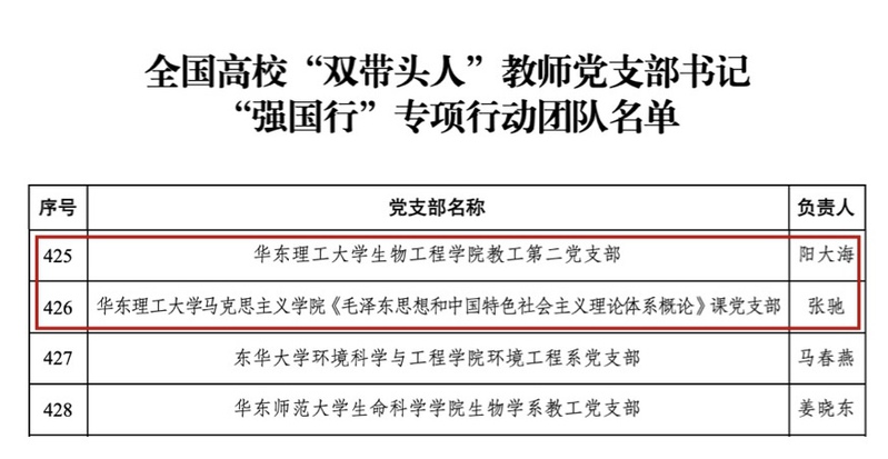 近日,教育部办公厅公布了全国高校“双带头人”教师党支部书记“强国行”专项行动(以下简称“强国行”专项行动)团队名单,Beat365生物工程学院教工第二党支部和马克思主义学院《毛泽东思想和中国特色社会主义理论体系概论》课党支部成功入选。